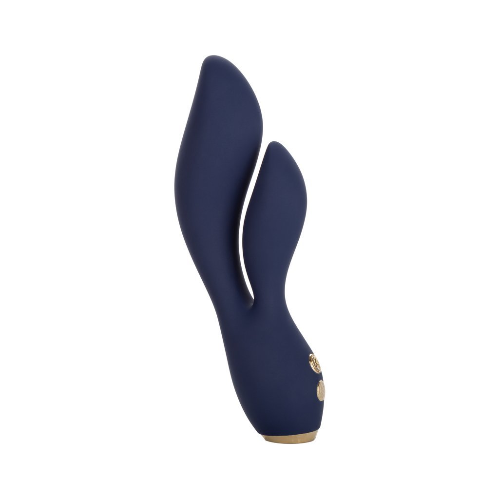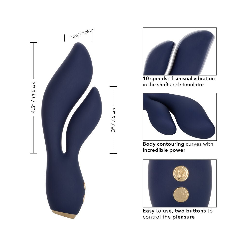 This high-powered rabbit massager is created with a curved g shaft and a naturally contoured stimulator to envelope your most intimate curves. An intense motor inside of the flexible shaft and another inside the teaser put rumbling vibrations for playfully powerful stimulation. Indulge in personalized pleasure while the curved shaft and teaser shimmies to the rhythm of 10 synchronized vibration speed levels. Control this variety of orgasmic options with the easy-touch control button. The flexible massager is made from a hygienically superior silicone with dazzling gold plated decorative accents. Whether you’re taking a dip with a lover or indulging in a steamy solo session. look forward to up to 150 minutes of waterproof vibration. Recharge pleasure and get back to playtime in only 2.5 hours with the provided USB cable. To take your pleasure to-go. a security travel lock features requires you to hold the on/off button for 3 second to turn on or off. Materials: Silicone (massager) ABS Plastic/ Metallic Plating Waterproof.