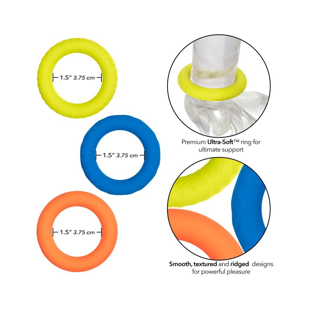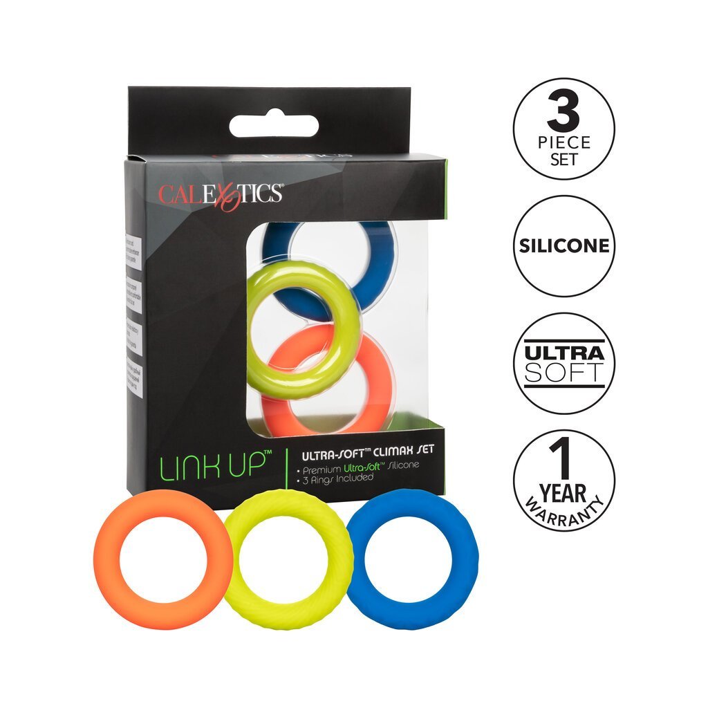 From bashful beginners to erotic experts. the Link Up Ultra-Soft Climax Set will wrap you up tight in pleasure with a set of 3 ultra-plush. ultra-stretchy enhancer rings. Each cock ring in this set has a unique texture. one smooth. one ridged and another rippled. for a sensational experience with every wear.