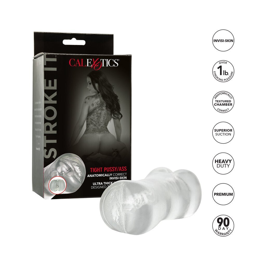 The Stroke It collection brings you the Tight Pussy and Ass stroker sleeve meant to thrill with your favorite stroking options; Dive deep into over 1 pound of heavy-duty stroking pleasure with two entry options and an ultra-tight textured chamber. The plush double-ended stroker gives you the best of both worlds with two realistic entry options. No matter which side you choose. the ultra-tight textured chamber creates a wonderland of pleasure for any member willing to slip inside.