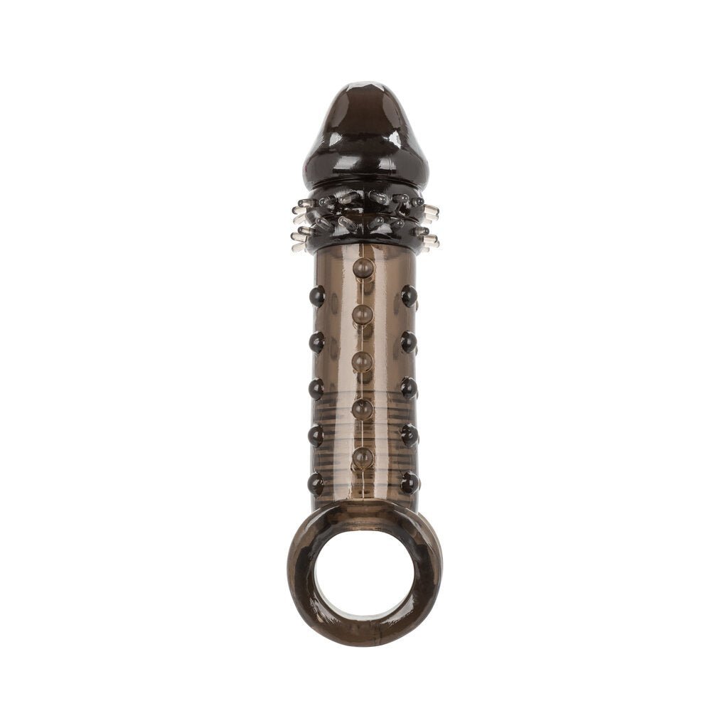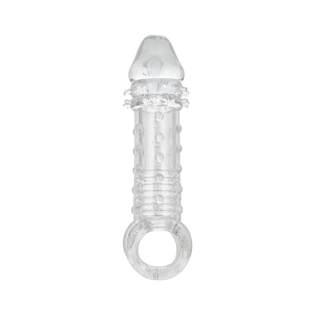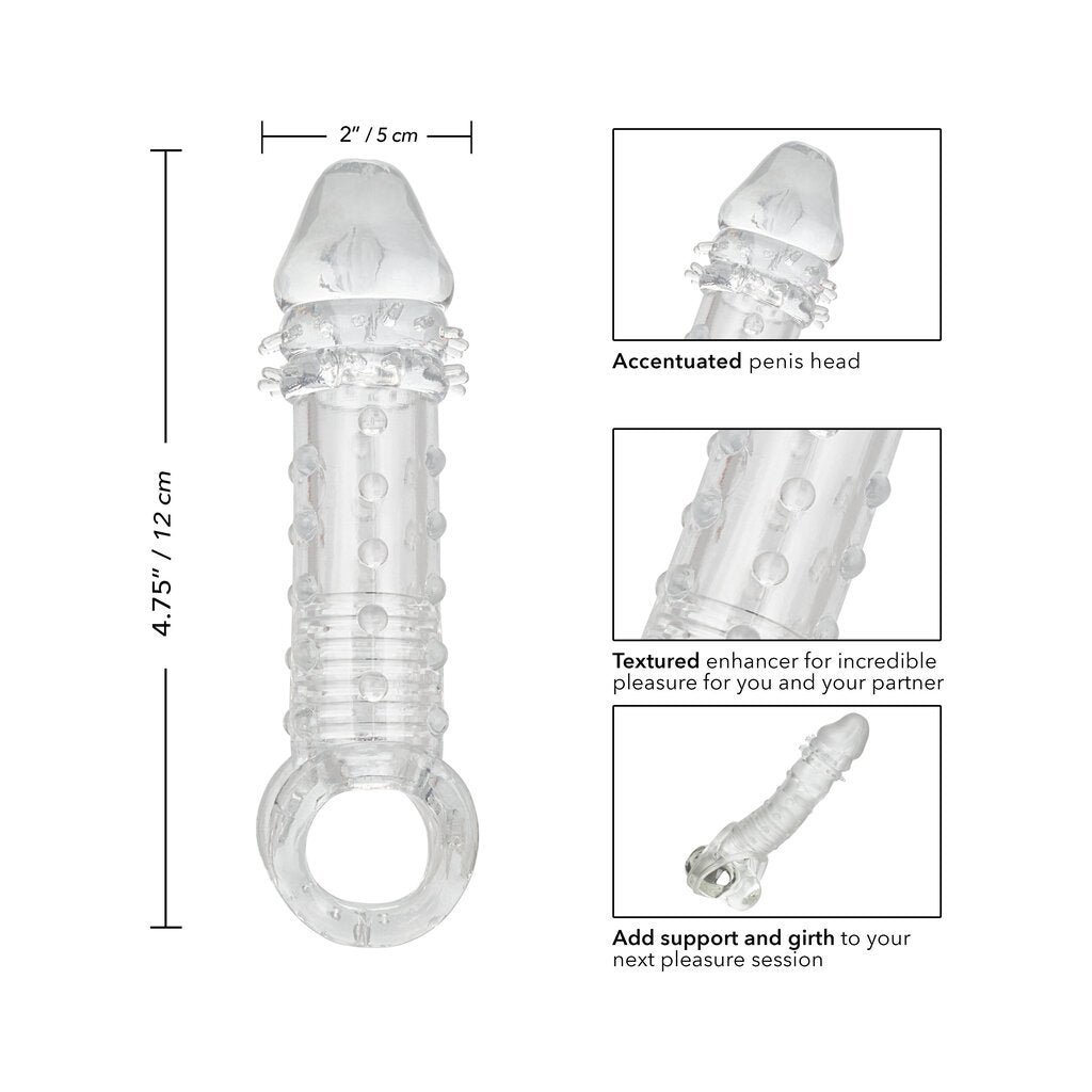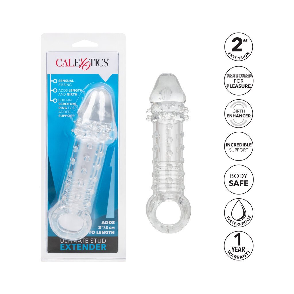 Indulge in you and your mutual satisfaction with the powerful Ultimate Extender male enhancer. While the closed-end sleeve suction and ribbed chamber thrill him. the added girth. thrilling studded texture and 2 inches of length will leave your lady shaking. The built-in scrotum strap and thick sleeve provided added erection support and increase stamina to prolong and intensify pleasure for any couple. Step up your pleasure and never settle for less when it comes to size. our super stretchy extender with supportive scrotum strap will have you and your lover craving more. more. more.
